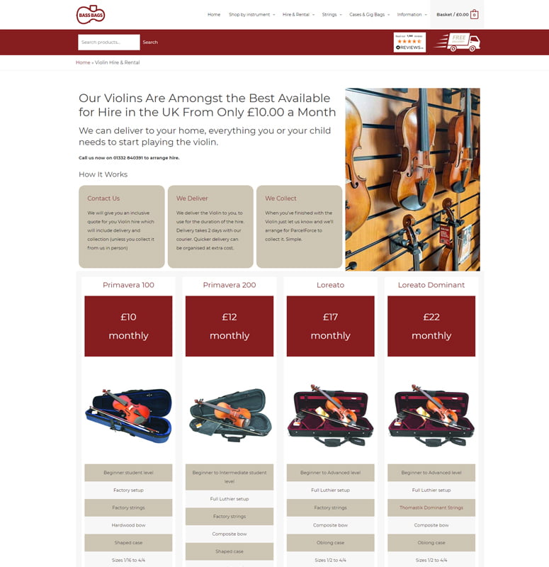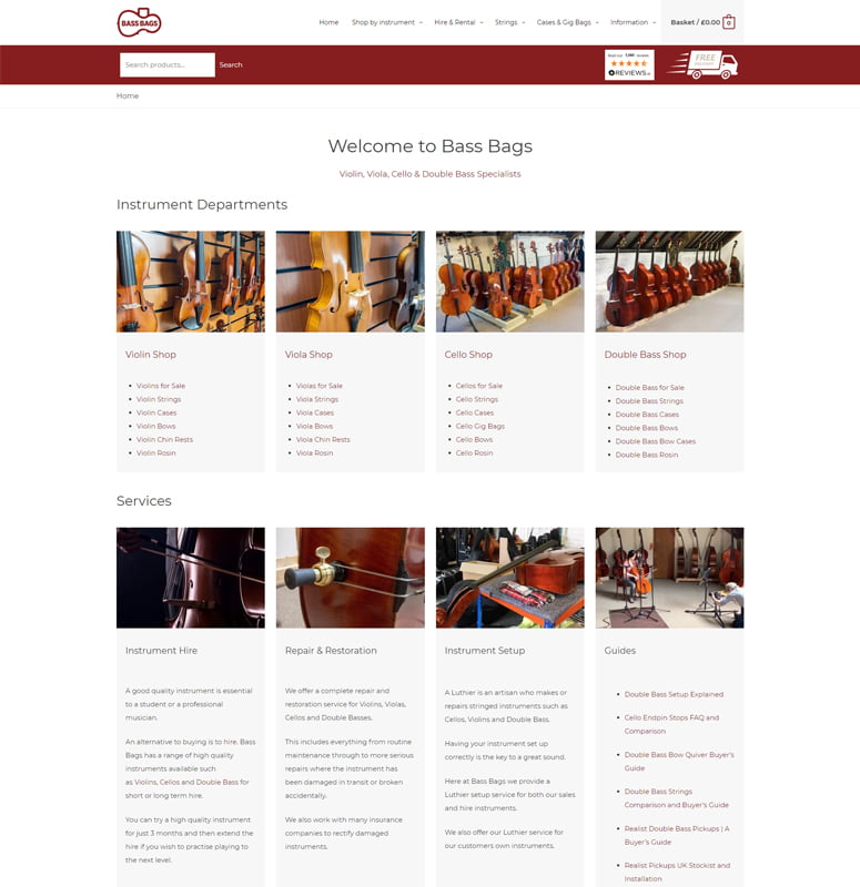 A full range of accessories for string instruments and cases & gig bags are also for sale through the website. The website needed to reflect all the services offered by bass Bags with high-quality information and guides about the instruments. It also should be an easy to use online shop for customers to buy and hire equipment and accessories.